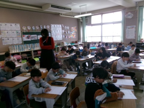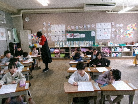 1年間で思い出に残った出来事について,絵日記風のワークシートに書いていました。今日は,文章を書いていきます。「どこに行ったか。」「何で行ったか。」「どんな所だったか。」など,どのように書いていけばよいかのキーワードを担任が提示することで,その時の様子を思い出しながら書いていました。