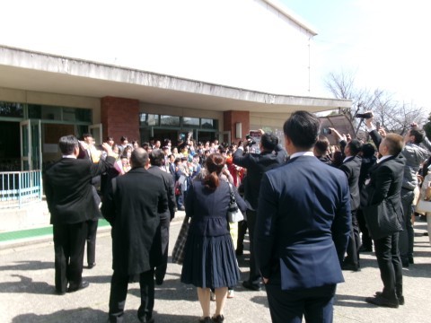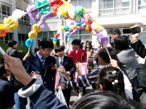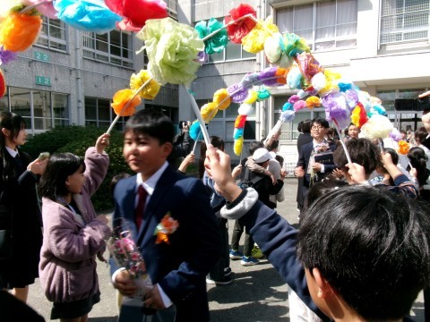 そして巣立ちの様子です。一輪の花をもらった後,花のトンネルを通って卒業していきました。中学校に行っても頑張ろう。応援しています!