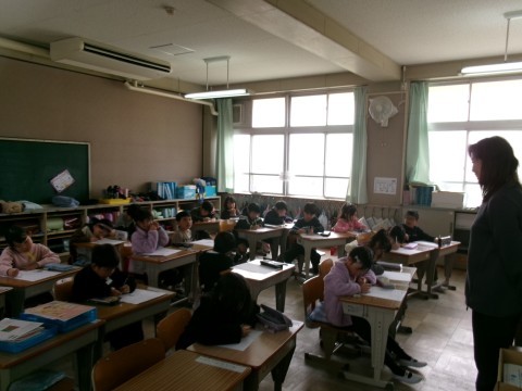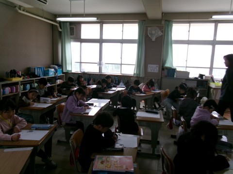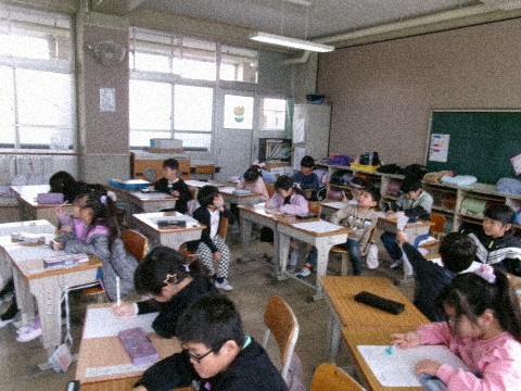 復習プリントに挑戦していました。みんな一生懸命取り組んでいます。早く終わった子は,裏面に好きな絵を描いていました。
