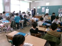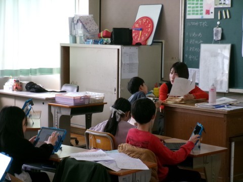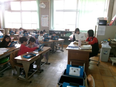 あゆみ渡しをしていました。1年生にも分かるように,ていねいに説明しています。待っている間は,タブレットで復習をしていました。