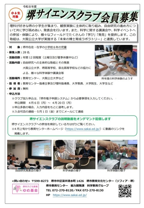 「堺サイエンスクラブ」は堺市教育委員会が主催の活動で、理科が好きな堺の小学6年生が集まり、