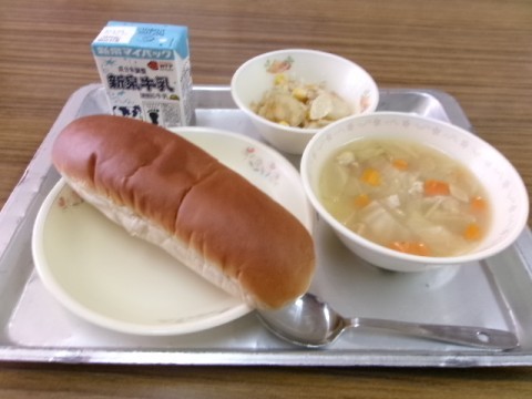 今日のメニューは,黒糖パン,牛乳,チキンブロス,ツナとポテトのマヨネーズ風味焼きでした。