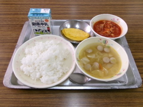 今日のメニューは,ごはん,牛乳,野菜スープ,オムレツ,セルフチキンライスでした。