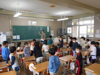 今日は,ひらがなの「り」を学習していました。「り」のつく言葉を言った人から座っています。きちんと発表している人の方を向いて聞くことができていました。