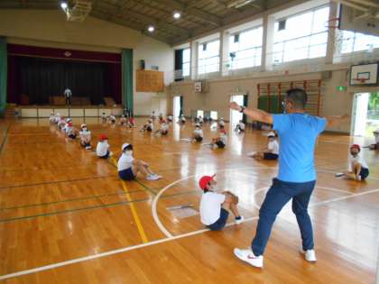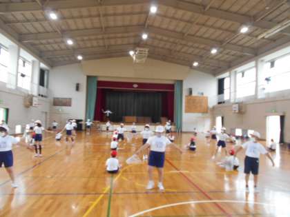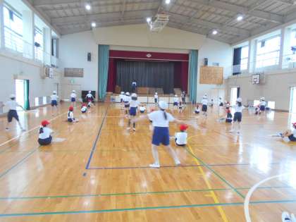 体育大会のダンスの練習を行っていました。先生が踊り方のお手本を見せ,子どもたちは実際に踊りながら踊り方を覚えていきます。右回りと左回りなど,間違えやすい所に注意しながら一生懸命練習していました。