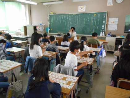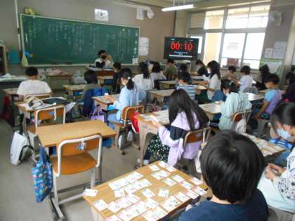 都道府県カルタに取り組んでいました。先生がどこかの都道府県の特徴をいくつか言う間に,該当する都道府県のカードをとるというものです。まずは,自分の机の上に47枚カルタを広げて,各自でいくつかのヒントを元にカードを取っていました。