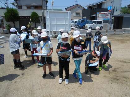 社会科の学習で,自分たちのまちの様子について学習してきました。今日は3地域に分かれて,実際に校区にはどんなものがあるかなど探検に出かけ,調べた事を元に地図を作成しようとしています。
