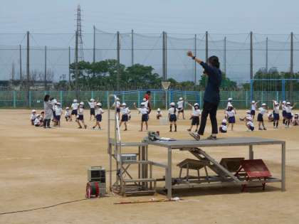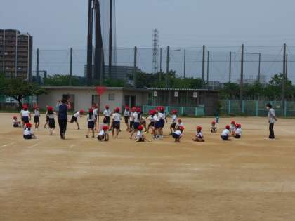 団体競技の「玉入れ」の練習をしていました。かごのすぐ下に○を描き,その中に入らないようにすることで密を防ぎながら競技をしていきます。