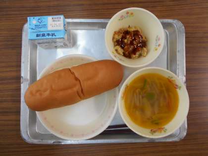 今日の給食のメニューは,コッペパン,肉団子スープ,お好み焼きです。