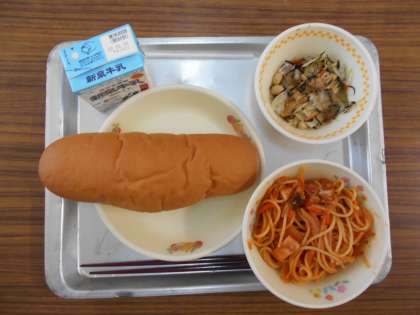 今日のメニューは,コッペパン,ミートスパゲティ,和風サラダでした。ミートスパゲティは昔から変わりませんが,おいしいです!