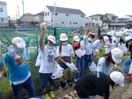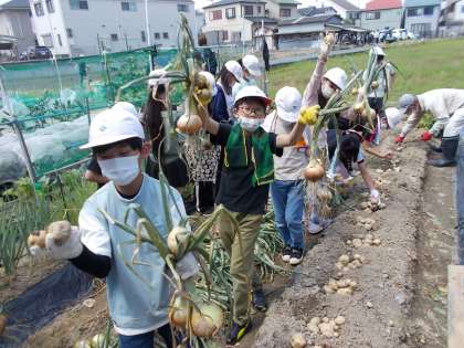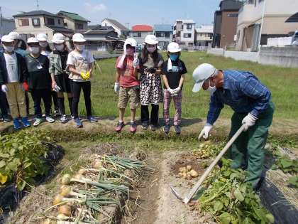 草刈りをした後は,地域の方が5年生のために作ってくださった玉ねぎとジャガイモを選んで持って帰らせていただきました。ずっしりと大きな野菜たちを,新鮮なうちに食べていただけたらと思います。