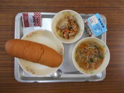 今日の給食のメニューは,コッペパン,春雨スープ,豚肉のマスタード焼き,チョコレートクリームです。
