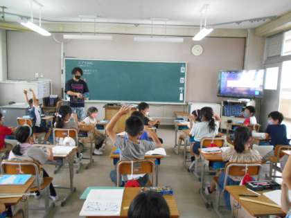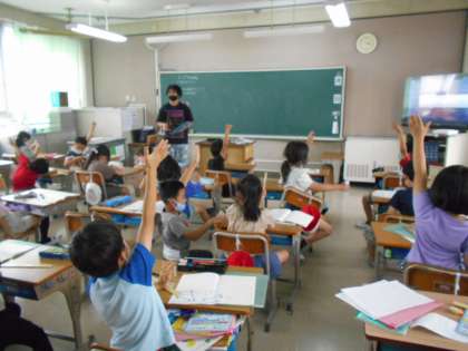 長さの学習をしていました。「1cm」を学習したので,「1cm」が2つ分では何cmになるのか,3つ分ではなど,ものさしを大画面TVに映しながら確認していました。