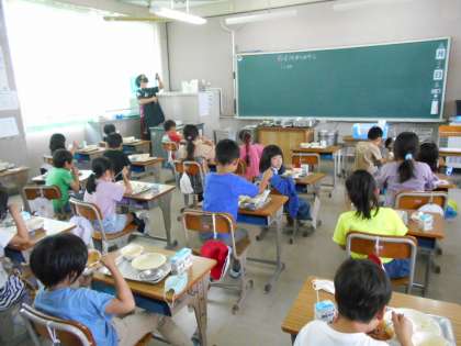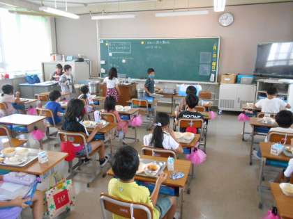 給食を食べている様子です。今日は子どもたちの好きなメニューの一つであるハヤシライスだったので,みんなしっかり食べていました。