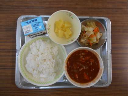 今日のメニューは,ハヤシライス,ツナサラダ,パインコンポートでした。子どもたちの好きなメニューの一つです。