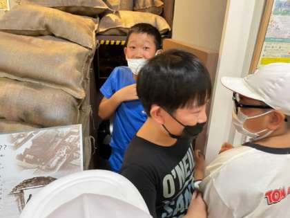 たくさん学んだ後は、ソフィア堺でお昼ご飯を食べました。食べ終わった人から、人権や平和,環境についての企画展示を見ました。防空壕へ入る体験をしたり当時の実物資料を見たりして、学びを深めることができました。