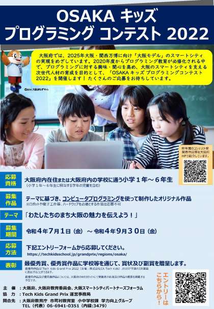 大阪府教育委員会から,小学校プログラミング教育の充実と,児童のプログラミングに対する興味・関心を高め,大阪のスマートシティを支える次世代人材の育成を目的とした,「OSAKA キッズ プログラミングコンテスト 2022」の開催についてお知らせがありました。