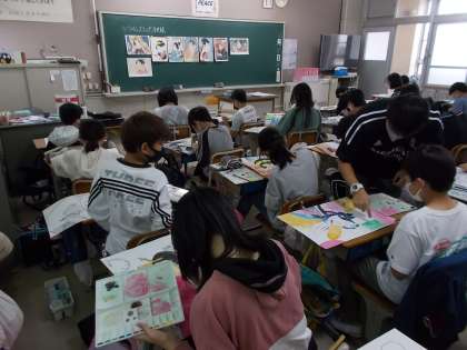 「タイムスリップ浮世絵」に取り組んでいます。浮世絵を生かして,いかに現代にタイムスリップさせるのか,子どもたちの自由な発想が楽しみです。