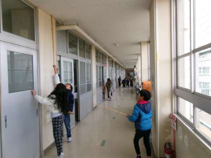 長さの学習の続きをしていました。今日は30cmものさしでなく,1mものさしを使って,窓の長さや廊下の長さも測っていました。廊下の長さは,1mものさしを何回もつなげながら測っていました。