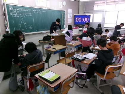 2組も,コンパスを使って二等辺三角形を描いていました。コンパスの使い方だけでなく,机の上からすぐに片付けるなどもきちんと指導していました。描き終わった子は,ミニ先生をしてくれています。