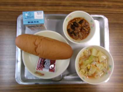 今日のメニューは,コッペパン,マカロニスープ,チリコンカン,チョコレートクリームでした。