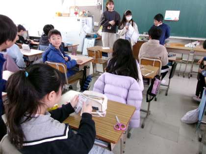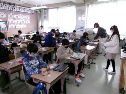 能登半島地震への募金袋を作っていました。児童会の児童がタブレットを活用して募金袋のデザインをし,それを印刷して全校児童が袋を作ります。少しでも被害にあわれた方々のために有効に活用してもらえたらと願っています。