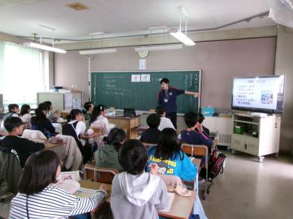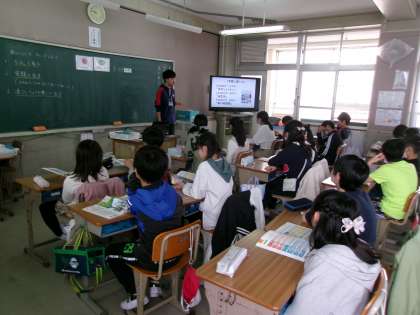 5年生から,これまでの「外国語活動」から「外国語」へと変わります。そこで,今年1年間で学習する内容を大まかに説明していました。