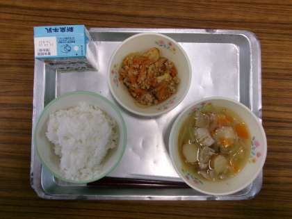 今日のメニューは,ごはん,塩ちゃんこ汁,揚げじゃがのそぼろあんかけでした。