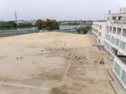 月に一度の安全点検のため屋上に上がると、4年生が体育をしていました。広い運動場いっぱい走り回っていました。