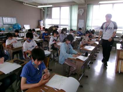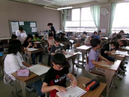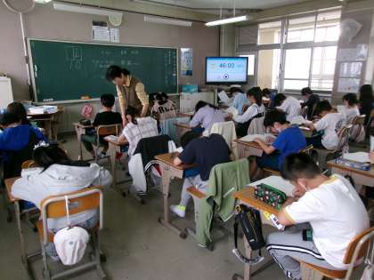 今日は,府下共通の「すくすくウオッチ」という学力テストを実施しました。この写真は,解答用紙に出席番号などを書いているところです。