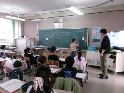 「3.75」をいろいろな方法で表すという問題に挑戦していました。「全員が1人で解けるように班で協力しよう」というめあてを持ち,みんなで意見を交流しながら考えを深めていました。