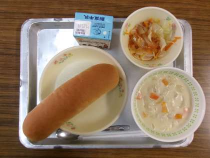 今日のメニューは,コッペパン,クリームシチュー,イタリアンサラダでした。