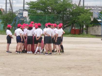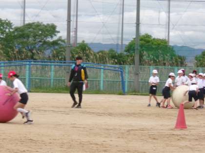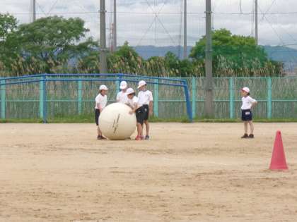 体育大会の団体競技の練習をしていました。大玉ころがしです。チームごとに作戦ややり方の工夫を考え,それを実際に試していました。