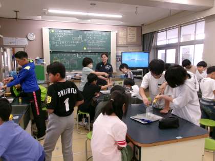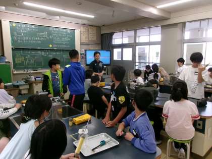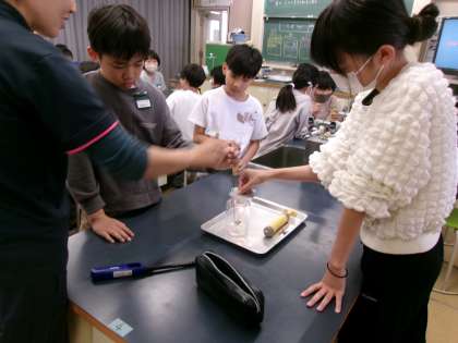 物が燃えると空気中の酸素や二酸化炭素はどうなるのか実験していました。気体検知管を利用して,ろうそくを燃やした後のビーカーの中の気体を採取し,それぞれの気体がどのくら燃えるのに使われたのかを調べます。