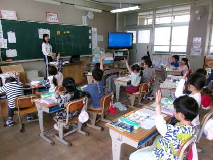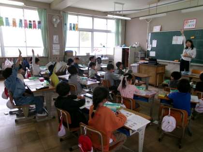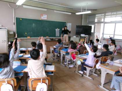 数の分解を行っていました。7は「3と…」のように,合わせて7になる数を見つけていきます。教科書の挿し絵を見せたり実際にポケットの中に隠したりして,楽しみながら答えを考えていました。