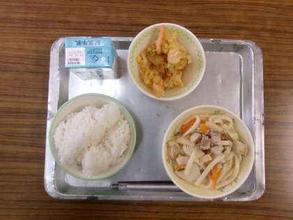 今日のメニューは,ごはん,かやくうどん,そら豆のかき揚げでした。