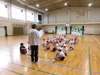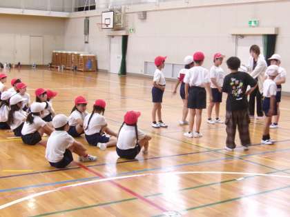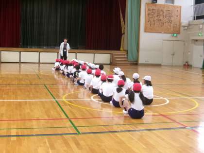 今日は雨なので,体育館で体育をしていました。体育大会で集合や徒競走などの並び方の確認をしていました。