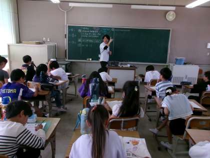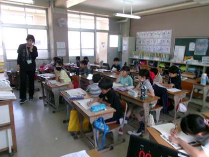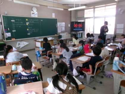 「12個の物を3個ずつ分けると何人の子に分けられる?」という12÷3のわり算のやり方を考えていました。「12-3=9,9-3=6,…」など3ずつひき算していって,4回ひき算すると0になるから答えは4人と発表する子がいて,みんなの考えを深めることができました。