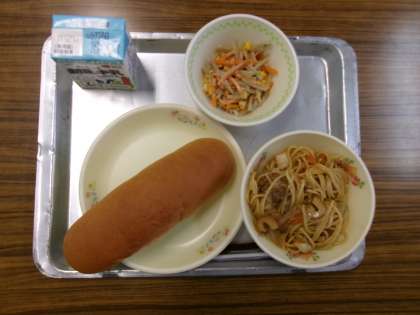 今日のメニューは,コッペパン,ソーススパゲティ,ごぼうサラダでした。