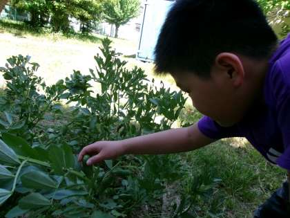 今日は、昨年度に植えた「そら豆」の収穫をしました。そら豆は、サヤが空に向かって実るから「空豆」と言われています。