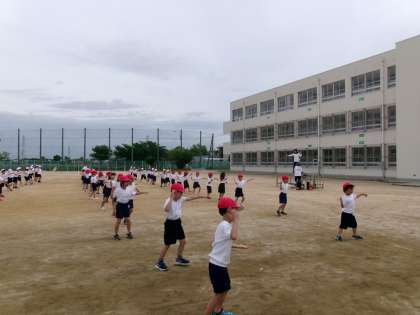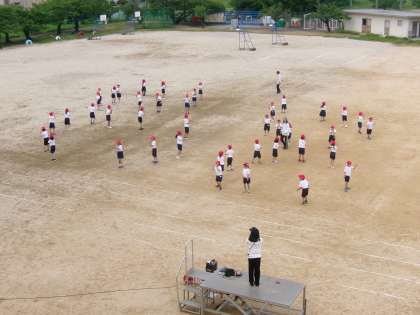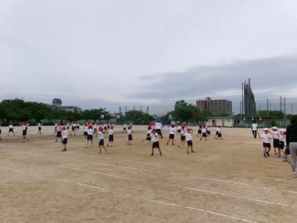 運動場で体育大会の練習をしていました。今日はダンスの練習です。ダンス自体はだいぶ踊れるようになってきたので,今は入場の際の位置や隊形移動の位置を覚えているところです。