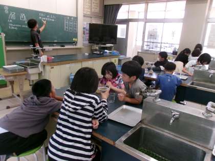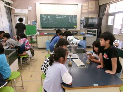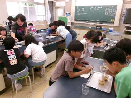 運動場の土で,きめの細かいものと大きいもので水がしみ込む早さを比べていました。子どもたちの予想通り,きめの大きい土の方が早くしみ込んでいました。