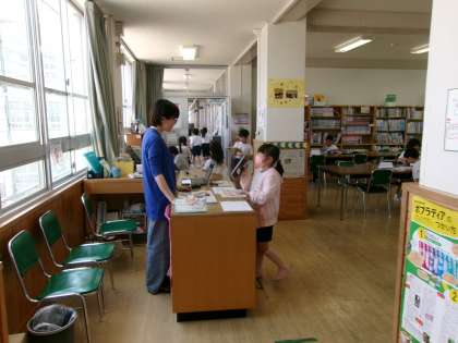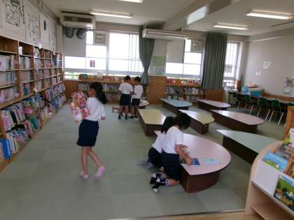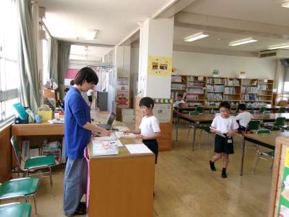 図書室で本を借りていました。自分の好きな本をいろいろと選びながら,決まった子から貸し出しの手続きをしてもらっています。