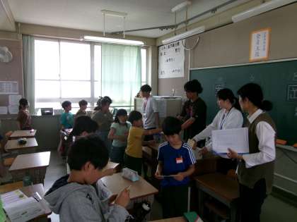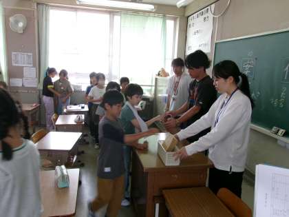 体育大会の入場時間の抽選をしていました。今年度から,全学年の児童(家庭数)がくじを引きます。AからEまでのシールが封筒に入っており,その封筒を今日持ち帰っていると思いますので,ご確認ください。