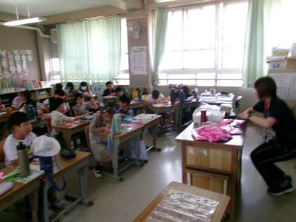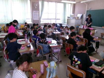 体育大会のダンスで身につける手袋に名前を書いていました。3年生はピンク色の手袋をつけるようです。ちなみに4年生は,水色と黄緑色の手袋をつけて踊ります。