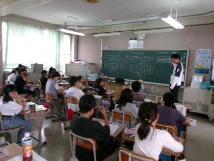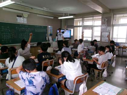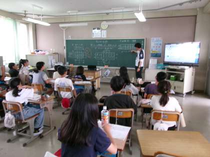「比例」の学習をしていました。比例の関係にある2つの数を表にまとめ,その表を見て気づいたことを交流しています。