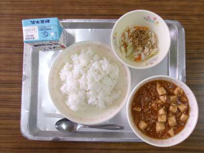 今日のメニューは,ごはん,マーボー丼,ナムルでした。