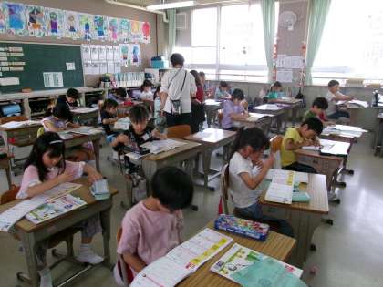 今日は新出漢字の練習をしていました。まず「池」という漢字を練習しています。子どもたちが練習している様子を見ながら,担任が「さんずい」の3画目の長さに気を付けて書くよう説明していました。