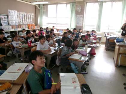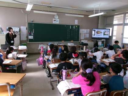 「まいごのかぎ」という物語文を学習していました。「アジのひらき」の中に鍵穴が開いており,そこに鍵を入れたという記述があり,子どもたちに「アジのひらき」の写真を見せていました。この物語文は,とてもおもしろいものに鍵穴があり,そこに鍵を入れると不思議なことが起こるという内容です。今日は,四場面で起こったことをまとめる授業でした。