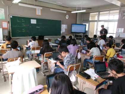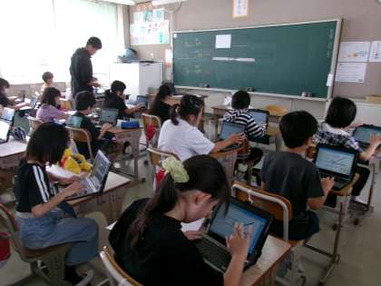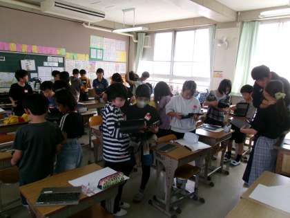 角度の学習をしていました。180度より大きい角度を求める時に,どうやったら求められるかについて,タブレットに自分の考えを書きこんで,それを全員で交流していました。